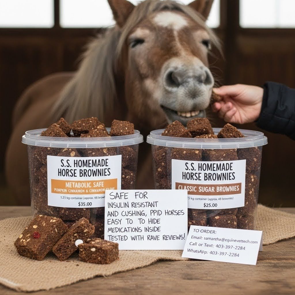Search no more!! After not only having an Insulin Resistant horse and a Cushing’s horse, and struggled for years trying to get their medications into them, I decided it was time to create metabolic safe horse brownie so that I could easily hide their medications and give them a treat at the same time without feeling guilty about it.